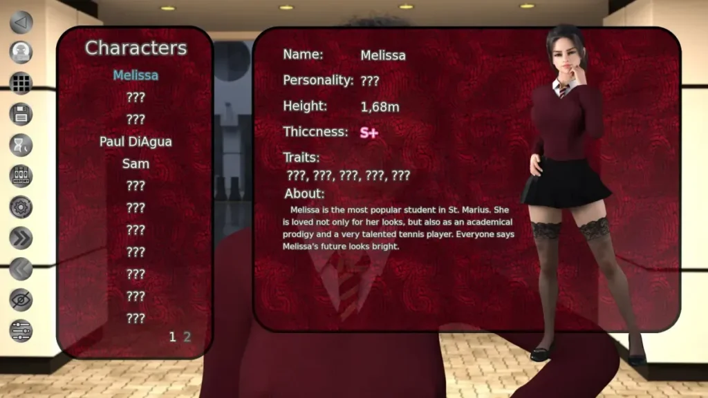 Central figures include Melissa herself, whose life is far more complicated than it appears, and a cast of students and teachers each with motives, secrets, and schedules you can influence. Building a connection with the stern but possibly kind-hearted Ms. Share might grant you access to faculty records. Alternatively, getting closer to Karina, a student with her own shadowy past, could open up the underground student network.
